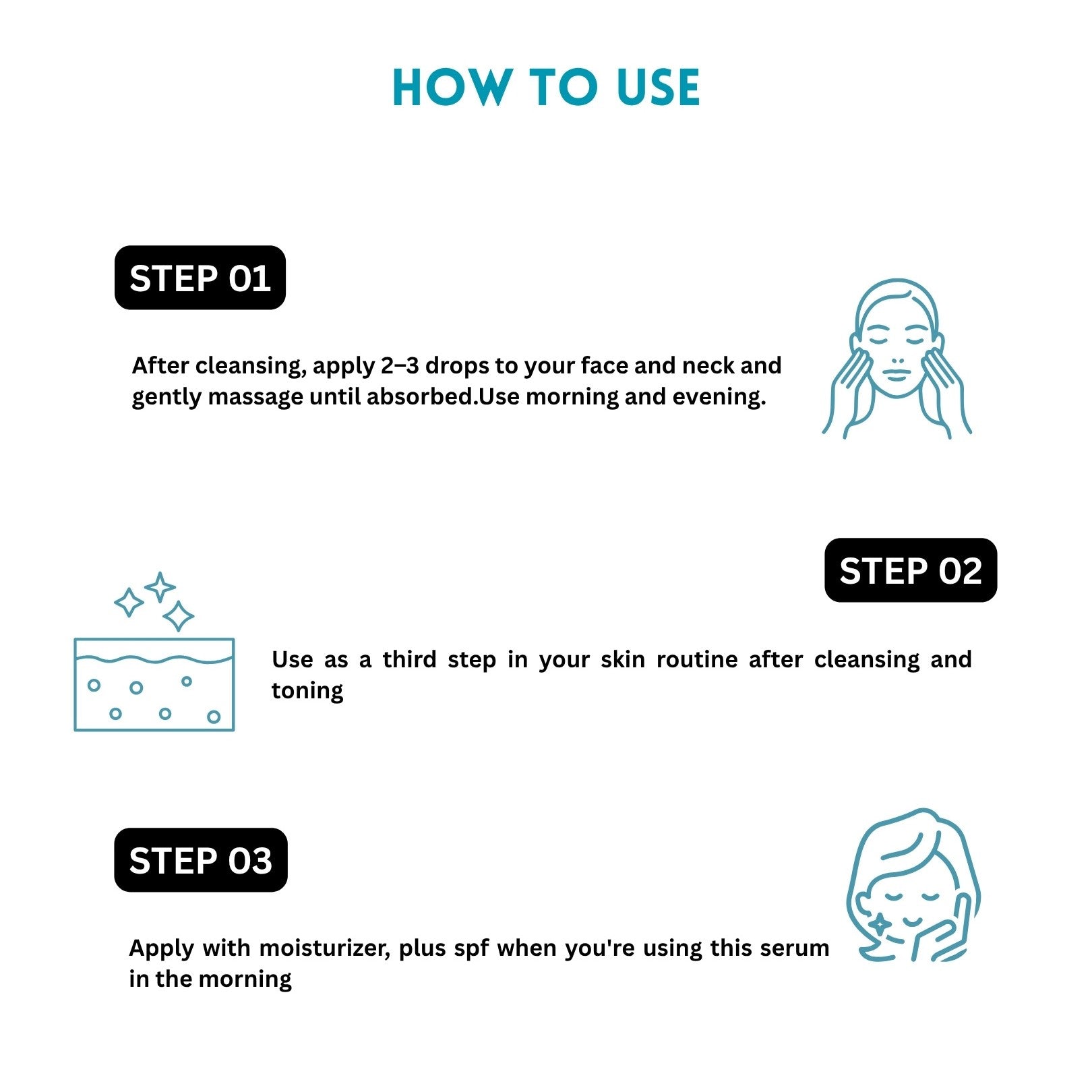 After cleansing, apply 2–3 drops to your face and neck and gently massage until absorbed. Use morning and evening.