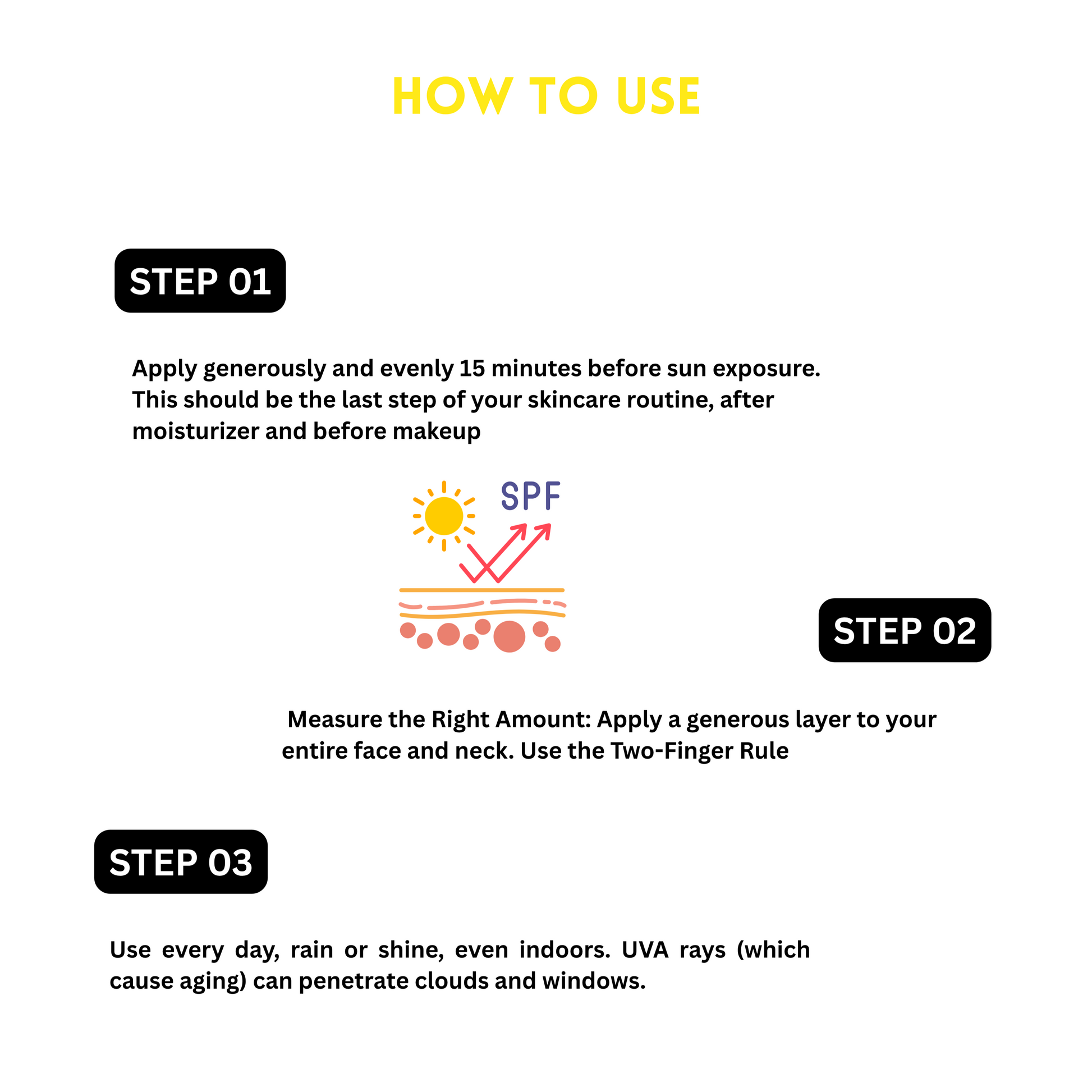 Apply evenly 15–20 mins before sun exposure. Reapply every 2–3 hrs if required. Use daily for best results.